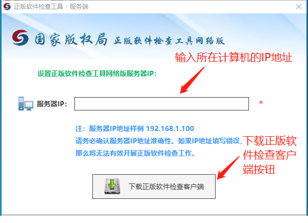 (1) 系统管理人员运行“正版软件检查工具网络版服务端”,点击“下载正版软件检查客户端”按钮,弹出正版软件检查工具网络版客户端下载界面。输入“正版软件检查工具网络版服务端”所在计算机的IP地址,再点击“下载正版软件检查客户端”按钮,将“正版软件检查工具网络版客户端”安装程序压缩包保存至本地磁盘。