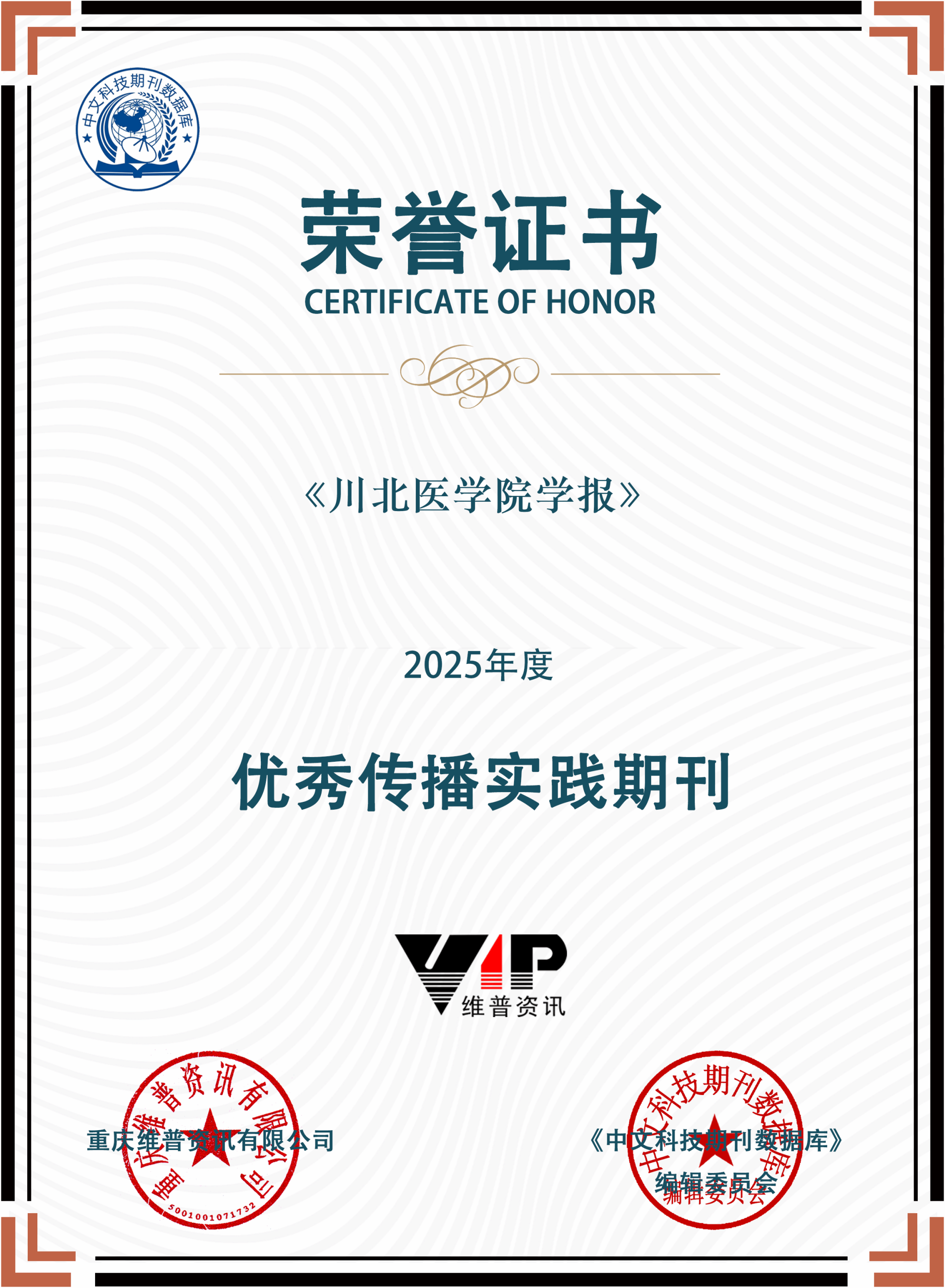 近日,《川北医学院学报》在学术期刊评价中再次取得突出成绩,荣获由重庆维普资讯有限公司与《中文科技期刊数据库》编辑委员会联合颁发的两项2025年度荣誉——“学术影响力卓越期刊”与“优秀传播实践期刊”。