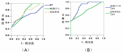 A. PT、ALBI评分、ICG-R15单一指标预测PHLF的ROC曲线;B. ALBI评分联合PT、ICG-R15联合PT预测PHLF的ROC曲线。