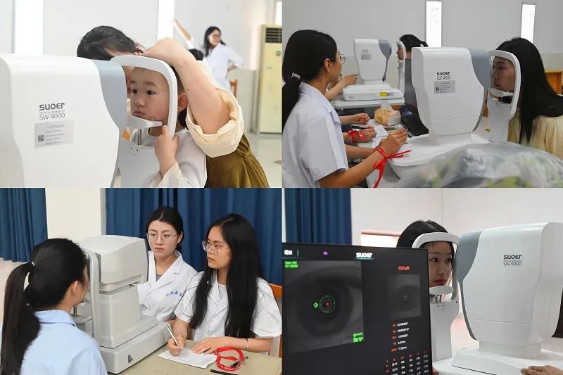 活动现场,眼视光医学院志愿者秉持着严谨、认真的态度,以科学的测验方法熟练使用专业的诊断设备,对前来参加活动的300余名校内师生进行了免费验光检查。检查分屈光定量(电脑验光、检影验光、插片验光)、眼位检查、立体视检查、色觉检查、裂隙灯显微镜检查、眼底镜检查等六个部分;在开展免费验光检查的同时,志愿者们还从专业角度为每一位受检者仔细解答疑惑,并针对每一位受检者实际提出防治建议,受到了广大师生的一致好评。