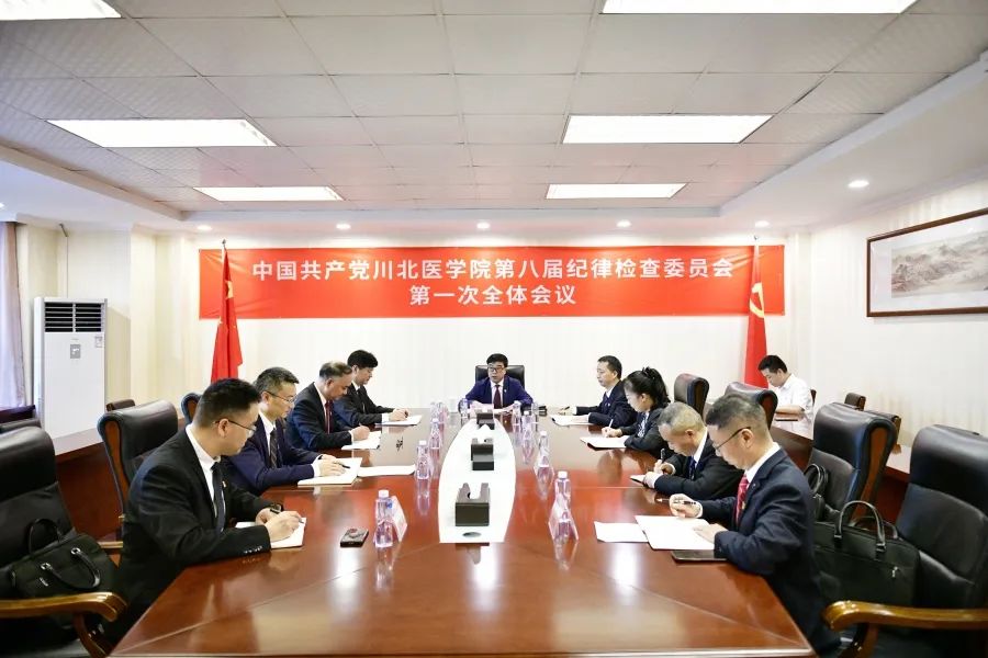 会场气氛庄重肃穆,主席台帷幕中央悬挂着的中国共产党党徽熠熠生辉,10面鲜艳的红旗分列两侧。主席台上方悬挂着“中国共产党川北医学院第八次党员代表大会”的会标。