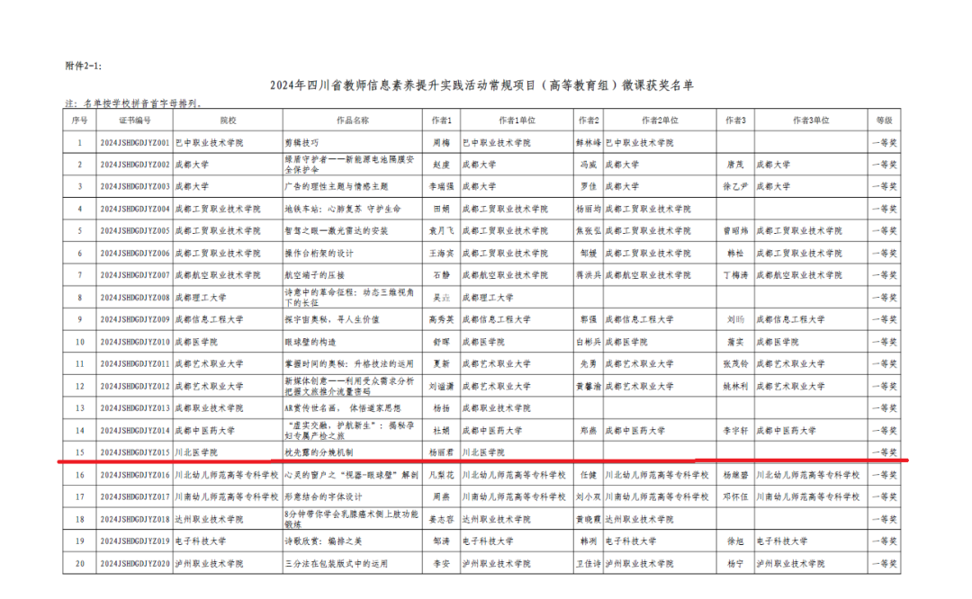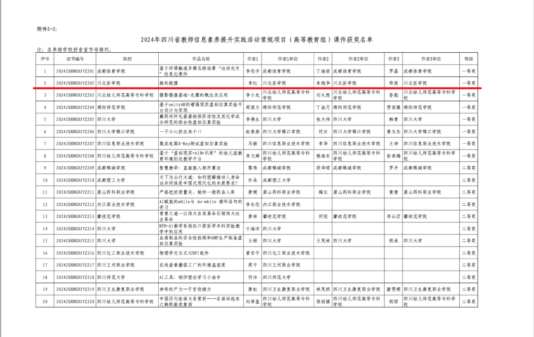 近日,四川省教育厅公布了2024年四川省教师信息素养提升实践活动常规项目获奖名单(川教函〔2024〕482 号),学校2024年6月向省教育厅推荐的5件作品全部获奖,其中一等奖三项,二等奖和三等奖各一项。分别是杨丽君老师的《枕先露的分娩机制》获高等教育组微课一等奖、李红老师团队的《脑的被膜》获高等教育组课件一等奖、贾钦尧老师团队的案例《基于“闯关实践+双线思政”实现“同步主动”的混合式教学案例》获高等教育组案例组一等奖,张怡玥老师的《执建党精神之笔 绘精神谱系新篇》获得微课二等奖,贾钦尧老师团队作品《药理学全程手游式案例地图小程序》获得课件组三等奖。