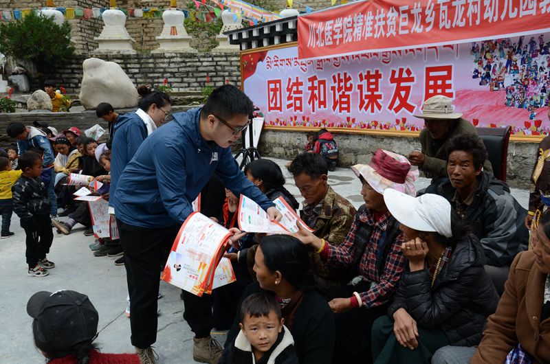 团队经过两天的长途奔波,克服种种困难,来到海拔3700多米的甘孜州稻城县。活动期间,专家组长王显飞博士一行在稻城县人民医院巴学国院长的带领下,来到县人民医院内科、外科进行了临床教学查房,对该科室的结构布置、区域划分、工作流程及制度建设等方面进行实地察看,双方对一些高原常见病与临床管理、人才培养等方面法进行了深入交流;团队在稻城县城、巨龙乡、香格里拉镇开展了3场义诊,义诊群众达300人次;向群众发放“糖尿病、高血压、包虫病、艾滋病”疾病宣传资料1200余份,为巨龙乡瓦龙村、同古村65位建档立卡贫困户建立了健康档案;开展了“健康童年”助学活动,为巨龙乡瓦龙村、同古村23位贫困儿童赠送了学习用品;在整个实践活动中将十九大精神及四川省第十一届三次全会精神宣传贯穿其中,队员们耐心、细致的为群众讲解党的精神和政策,为藏民群众带去党的关怀,积极激发他们努力实现美好生活。同时,我校医学影像学院党总支和临床医学院党总支还分别与瓦龙村、同古村三户困难党员家庭组成一对一结对帮扶,帮助他们尽快脱贫,以实际行动带动周围群众,充分发挥党员的先锋模范作用。