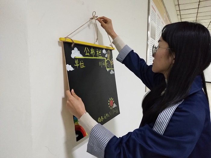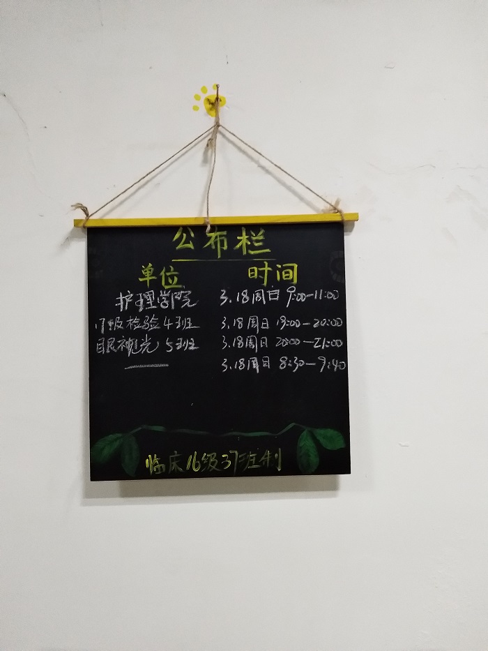 出于解决烦恼,重拾美好学习生活的愿景,三十七支部的同学们便产生了给自习室制作统一信息公示板的想法。通过基础医学院党总支与教务处、后勤管理处的多方协调沟通,同学们的想法最终得以实践,设计、采购、制作、统一挂放,又多次改进、美化。现在,自习室门边都挂上了同学们自制的小黑板公告板,虽然没有专业的定制那样精致,却赢得了同学们的一致认可,为大家的学习生活提供了便利,自成了一道别样的校园文化风景线。