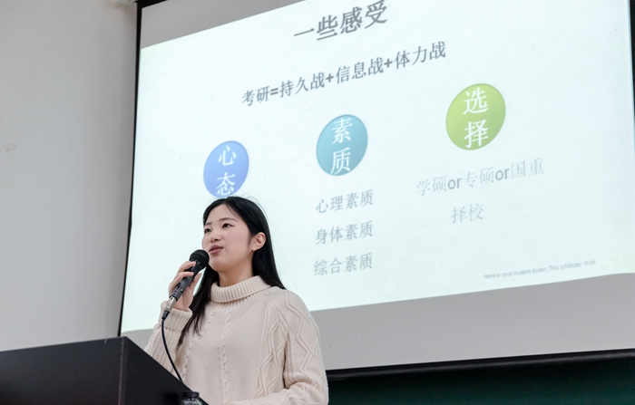 会上,张勋结合自身经历,用大量的考研实例和数据,就考研目标、考研规划、“西综”复习、政治复习和英语复习五个方面全方位地阐释了备考方略和考研重点。梁蕊则重点剖析了“专硕”和“学硕”的各自特点,她认为如何选择还要结合自己的生涯发展规划和实际情况,就她而言,选择“学硕”是希望在学术方面取得更深层次的造诣,有利于自己长远的发展。随后,顾沅芮以新奇的思想与不拘一格的表达方式在备考方法和学习心态两方面诠释了学习自信与方法自信以及自我肯定在备考过程中的重要性,他认为作为备考人应该相信自己,无论自己在校时的考试成绩怎样,只要有坚定的信心,摸索到适合自己的学习方法,最终必定能取得成功。李明奇则结合自己通过调剂最终被汕头大学录取的经历就考研复试调剂的相关信息收集、调剂方式方法、复试准备等方面作了交流,他的考研调剂经历堪称“史上最牛调剂经历”,给在场的所有同学很大的启示。杨茂沙就考研期间的备战经历、心态调节以及实习与考研的关系作了交流,她认为只要不抛弃、不放弃,坚持到底,就是一种胜利。最后石睿结合自己的学生会干部经历和考研经历就如何收集信息、提升素质、开阔眼界、发散思维等方面跟同学们作了交流,不管是对即将进入战场的大四学子还是在校的大三学子都有很大的启发。