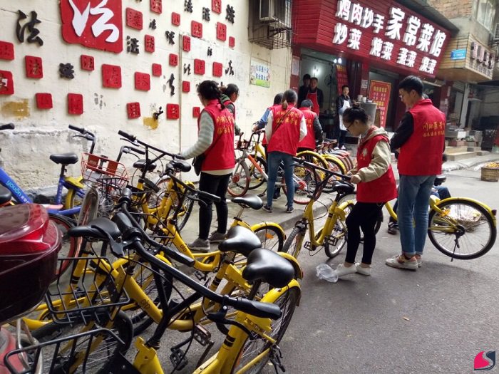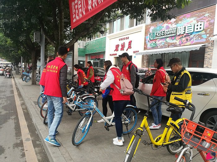 作为共享经济最具代表、最具人脉的共享单车,在打通城市出行“最后一公里”,提供绿色环保、方便快捷出行的同时,却因横七竖八地被摆放在人行道上,占压盲道、堵住垃圾桶,挤占有限的通行空间、随意逆行或在人行道上骑行等不文明现象饱受诟病。主题活动针对此顽症,我校志愿者分三组以学校顺庆校区为中心向周围辐射式展开活动。志愿者向市民们发放文明宣传单,引导公众文明骑行,文明停放,自觉遵守交通规则,并将一辆辆乱停乱放的共享单车放置归位,摆放整齐,整理成排。经过一天的志愿服务活动,校园周边站点的共享单车都整理完毕,道路变得干净整洁,来往行人纷纷竖起赞赏的大拇指,周边商家更是开心,“以前这里共享单车老是横一辆,竖一辆,乱七八糟。经过你们的整治,市容市貌微环境变得有序整洁多了。”