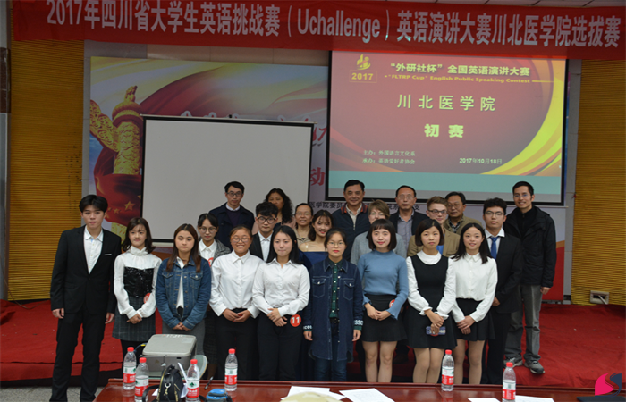 10月18日晚,2017年“外研社杯”全国英语演讲比赛川北医学院选拔赛在高坪校区图书信息大楼407教室隆重举行。来自我校的11名选手通过各年级、院系的筛选,进入了本次比赛。外国语言文化系主任杨小刚等8名中方教师及外籍教师Heather Fast以及Cameron Carlson担任比赛评委。
