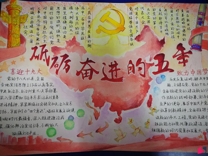 本次比赛面向基础医学院全体学生,同学们积极踊跃参加此次比赛,大量优秀作品涌现。参赛作品内容围绕“致力中国梦,喜迎十九大”这一主题,展现了十八大到十九大以来国家的高速发展、伟大实践、成功经验等内容,表达了学生对国家发展变化的认识与看法,体现出九零后学生对国家的认知与热爱。参赛作品绘画精美,书写工整,内容充实,为我校在十九大召开前夕的宣传工作增色不少。此次比赛共有40余位参赛者获奖,其中临床医学2017级胡越《砥砺奋进的五年》、王小燕《喜迎十九大》等6幅作品获得一等奖。