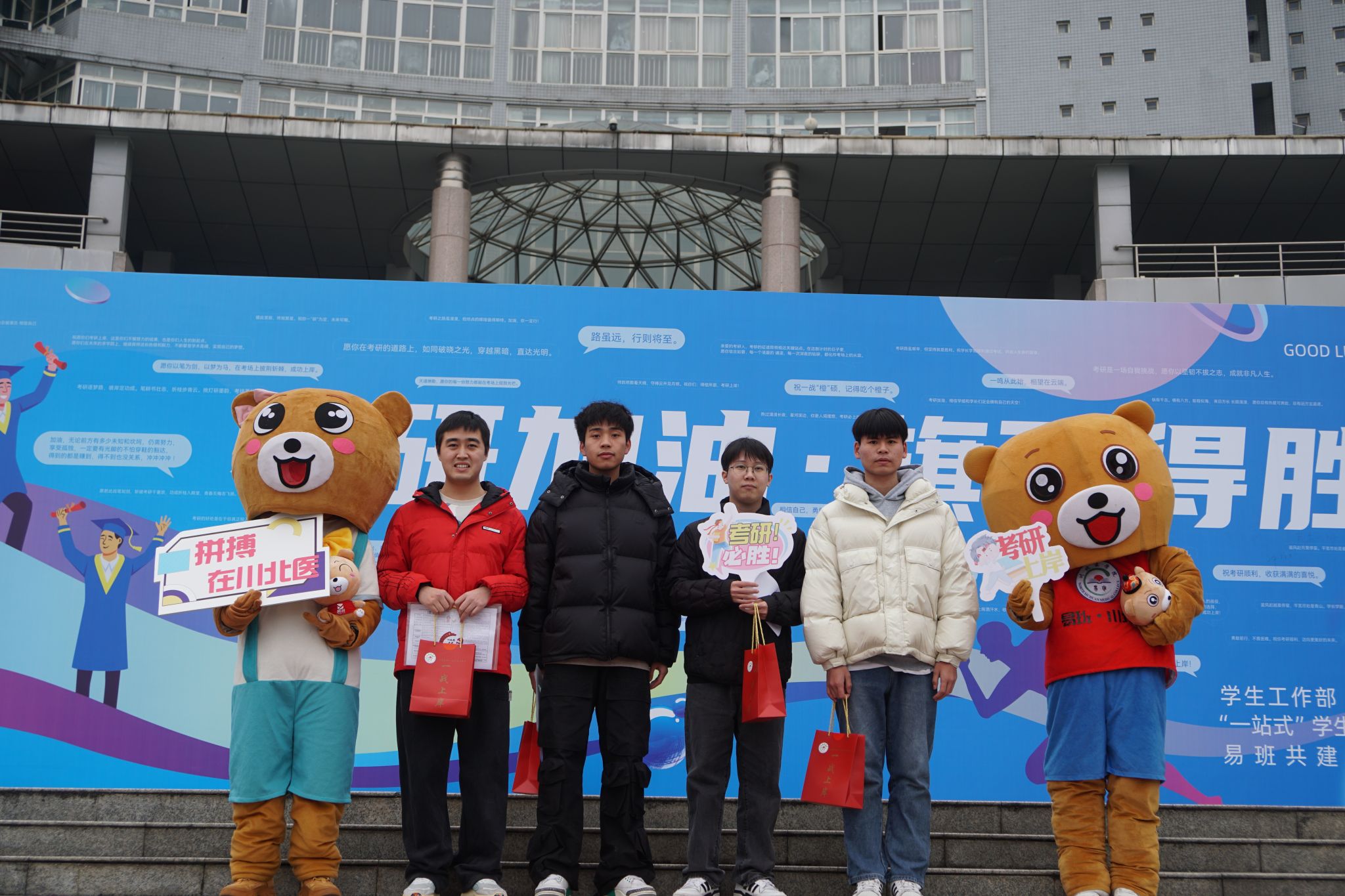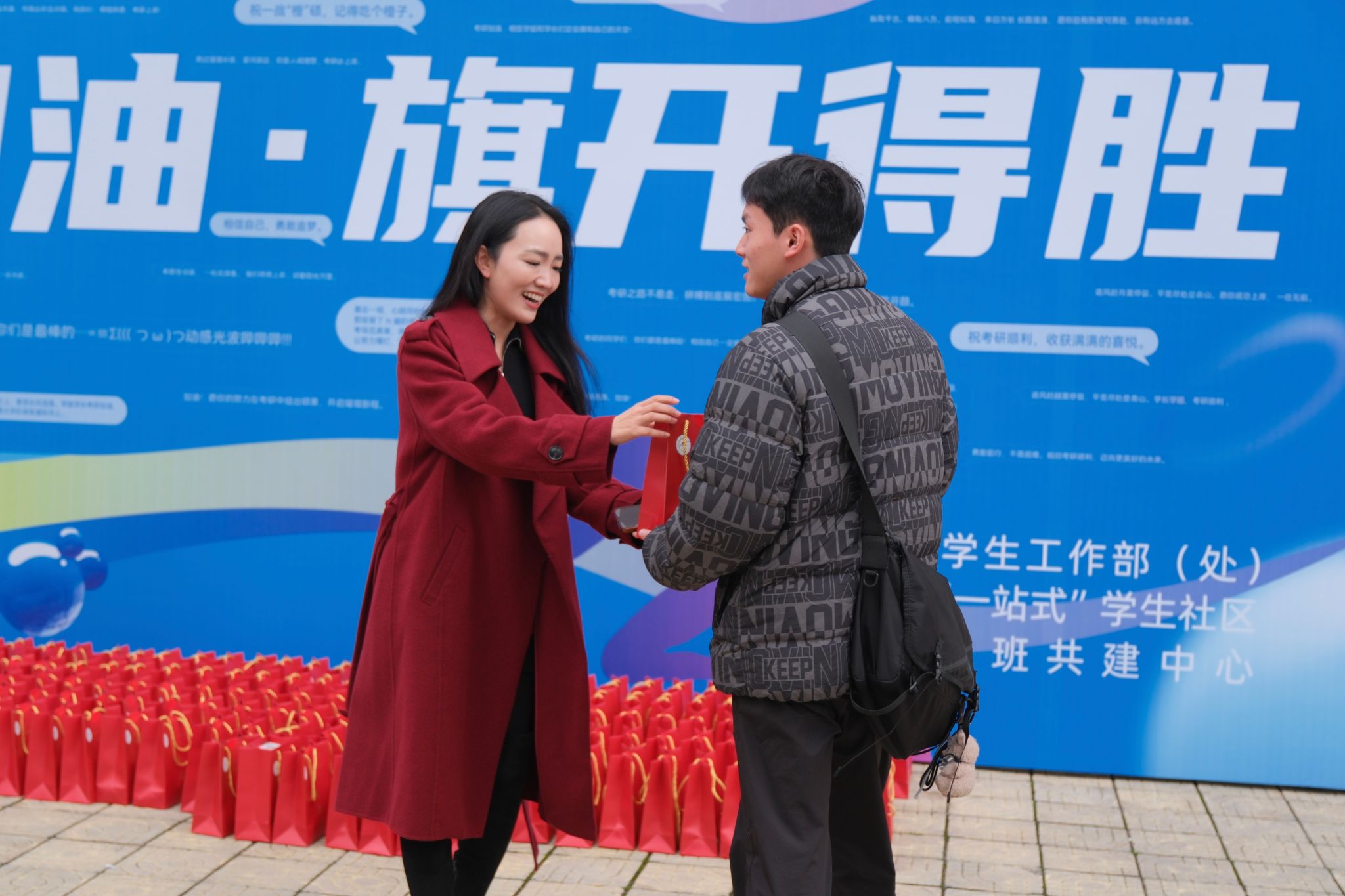 12月20日下午,在高坪校区图信楼广场和顺庆校区蓝花楹广场,学校精心准备了考研福袋,为前来熟悉考场环境的考研学子送上了一份特别的惊喜。福袋内,香梨寓意着“吉祥好运”,橙子则代表着“心想事橙”,棒棒糖寓意“甜蜜如意”,旺仔牛奶寄托了“考试旺旺”的美好愿望,“鹏程万里”签字笔则预祝每位学子在考试中一飞冲天、旗开得胜。每一份礼包都蕴含着学校对考研学子们的深切关怀与美好祝愿。前来查看考场的学生们纷纷被这份惊喜所打动。他们领取礼包后,脸上洋溢着幸福的笑容,纷纷表示将带着这份祝福,全力以赴,冲刺考研。