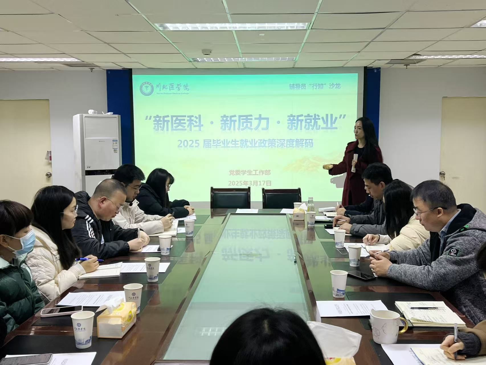 为深入贯彻党中央、国务院“稳就业”“保就业”决策部署,进一步提升辅导员就业指导能力,精准助力2025届毕业生实现高质量充分就业,学校2025年第一期辅导员“行知”沙龙在顺庆校区科技楼五楼学工部会议室举办。本次沙龙由学生工作部部长王帅亭子主讲,全体毕业年级辅导员参加。