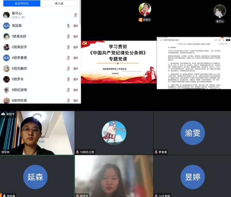 一是在线上,打造“云端课堂”,确保党纪学习教育“不漏学”。实习年级各党支部通过“腾讯会议”传达了学校党纪学习教育安排布置会议精神,宣读了《中共川北医学院委员会关于在全校开展党纪学习教育的实施方案》,领学了《中国共产党党员网络行为规定》,解读了《中国共产党纪律处分条例》,教育引导实习生党员要坚持以习近平新时代中国特色社会主义思想为指导,做到学纪、知纪、明纪、守纪,明确日常言行的衡量标尺,用党规党纪校正思想和行动,真正使学习党纪的过程成为增强纪律意识、提高党性修养的过程。