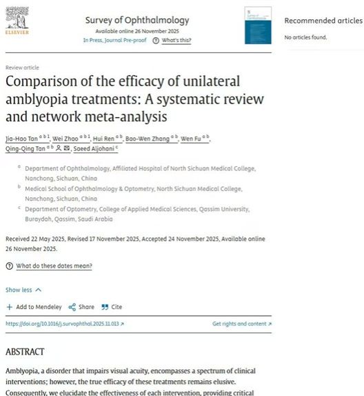 近日,我院谭青青副教授团队在国际知名眼科期刊《Survey of Ophthalmology》发表了题为“Comparison of the efficacy of unilateral amblyopia treatments: A systematic review and network meta-analysis”的研究论文。该研究系统比较了多种单眼弱视治疗方法的疗效,为临床诊治策略的科学制定提供了重要循证依据。论文通讯作者为谭青青副教授,第一作者为2023级医学技术(眼视光学方向)硕士研究生谭家昊。