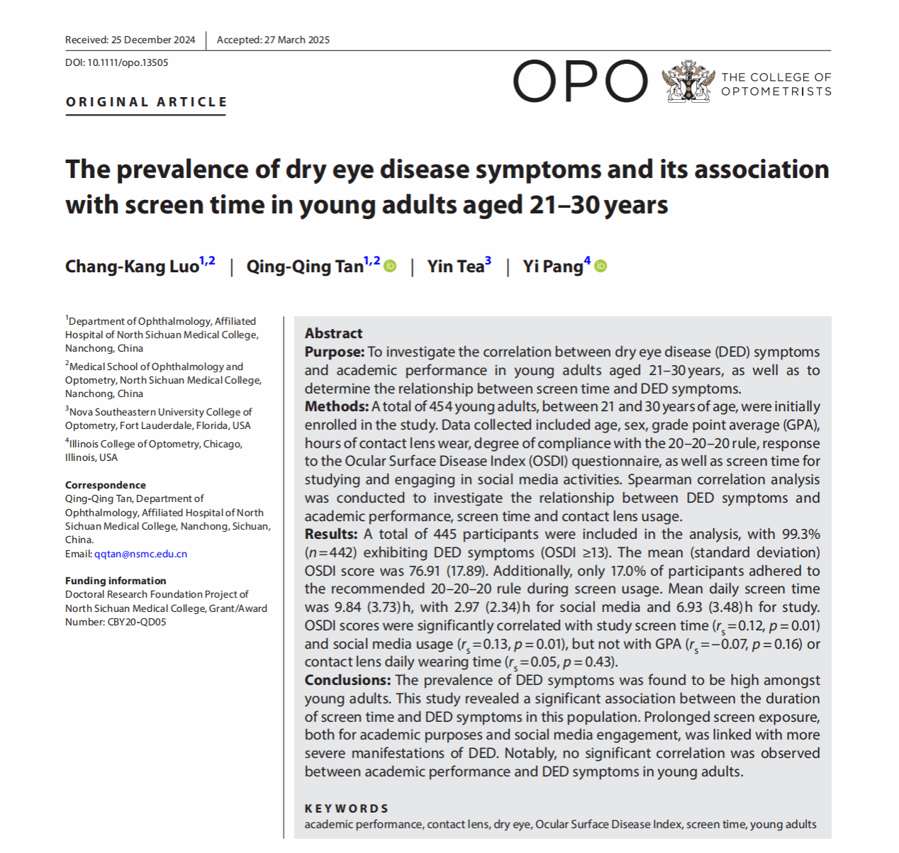 近日,眼视光医学院谭青青团队在国际眼科学与视光学领域知名期刊《Ophthalmic and Physiological Optics》(OPO)上发表题为“ The prevalence of dry eye disease symptoms and its association with screen time in young adults aged 21–30 years ”论文。研究生罗长康为文章第一作者,谭青青副教授为文章通讯作者。