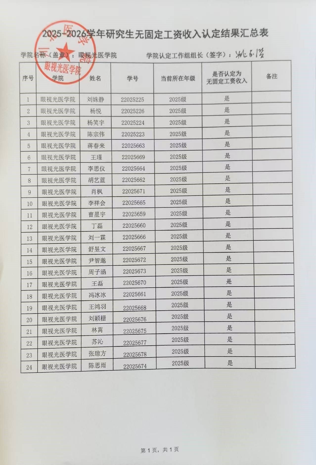 根据川北医学院研究生无固定工资收入认定工作细则,经研究生本人申请、班级评议小组评议认定、学院认定工作组审核,现将2025-2026学年眼视光医学院研究生无固定工资收入认定结果予以公示。