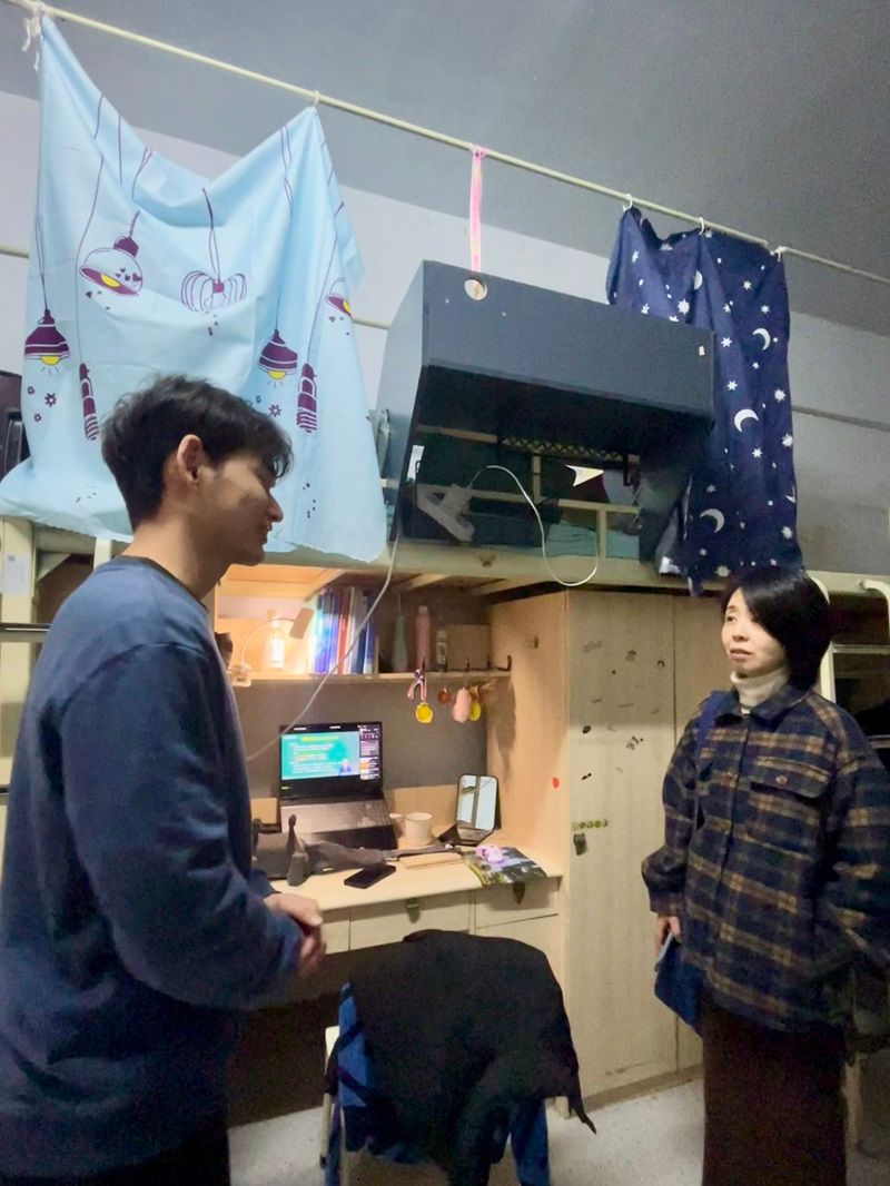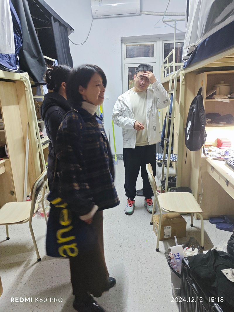 在走访过程中,老师们和同学面对面交谈,详细了解大家的学习、生活、思想状态,以及目前学业与就业上存在的困难。“生活上有什么困难?”“上课过程中有哪些地方觉得听不懂?”“准备考研还是就业?”“毕业论文准备的怎么样了?”一句句温情的话语让同学们感受到了来自学院冬日的温暖关怀。学院领导和辅导员着重进行了安全宣传,提醒每位同学要遵守校纪校规,注意宿舍用水用电安全,严禁使用违章电器,提醒大家提高反诈意识,保护好个人财产安全。老师们还叮嘱大家在学习过程中合理安排时间、劳逸结合,关注身体健康和心理健康,共同努力营造健康温馨、和谐文明的宿舍文化环境。