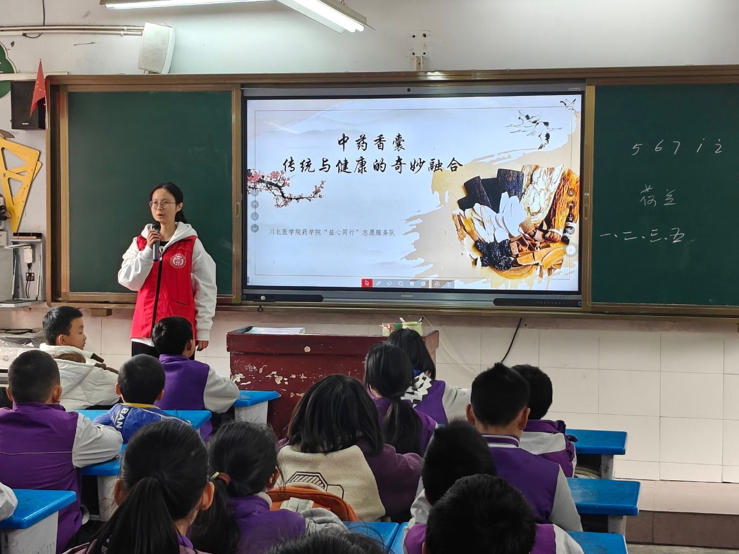 为弘扬中医药文化,厚植青少年文化自信,3月18日,川北医学院药学院“益心同行”志愿服务队前往南充市高坪区第六小学,为五年级50余名学生带来了一场别开生面的中医药文化体验活动。活动以“药香润童心,文化共传承”为主题,通过知识讲解、实践操作和互动体验,让小学生们近距离感受中医药的魅力。