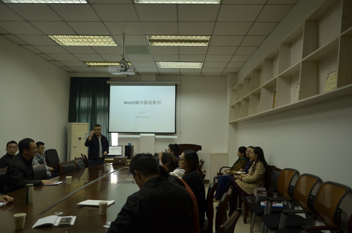 学术报告中,朱江老师系统地介绍了基于Mn(II)磁共振造影剂的研究工作。结合自己的研究经历,介绍了独立开展工作后研究方向的确立和磁共振成像原理和磁共振造影剂作用机理。针对临床Gd(III)造影剂肾源性系统纤维化和脑沉积安全性问题,利用Mn(II)较好的生物相容性,根据Mn(II)配位化学特点,通过优化配体结构,成功设计合成了一类高热力学稳定性,低毒性,高弛豫效率的新型磁共振造影剂。此外,朱江老师还介绍了其课题组在过氧化物酶响应磁共振造影剂方面的最新进展。报告结束后,师生们与朱江老师就报告相关内容进行了深入交流与探讨。
