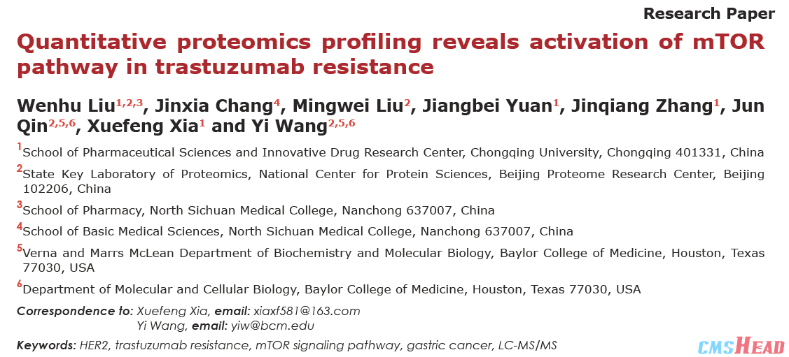 该论文从定量蛋白质组学结合生物学实验研究了胃癌Trastuzumab耐药机制,证实了胃癌细胞通过诱发上皮-间质转化(EMT)激活mTOR信号通路,导致癌细胞对Trastuzumab产生抗药性,暗示mTOR抑制剂有望成为Trastuzumab耐药有效治疗药物。本研究为胃癌Trastuzumab耐药机制研究提供了理论基础,也为延迟或逆转Trastuzumab耐药提供了可能的治疗靶点。