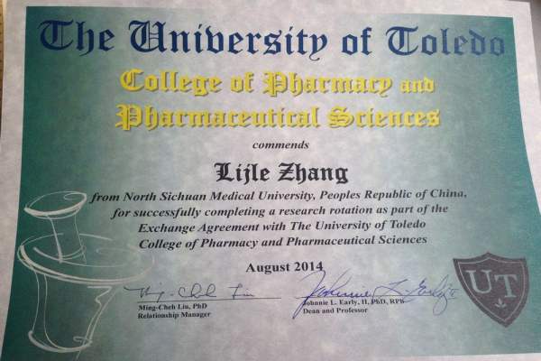 2014年7月13日至8月11日,我校2011级本科药学专业张礼杰同学赴美国托莱多大学药学院进行了为期近一个月的暑期交流学习。托莱多大学药学院对此次本科生交流学习非常重视,安排了形式多样、内容充实的参观交流和学习实践活动,除了参观托莱多大学校区和药学院实验室以及部分实验室师生交流外,还主要参与Ming-Cheh Liu教授实验室中硫酸氨基转移酶与靶向物质反应产物的提取分离等研究工作。此次本科生暑期交流学习是我校与托莱多大学药学院达成互派本科生交流学习等初步合作意向后学生培养的有益尝试,不仅有利于拓展学生的视野,提高学生的综合素质,也有利于为进一步扩大与托莱多大学药学院的交流合作积累经验。