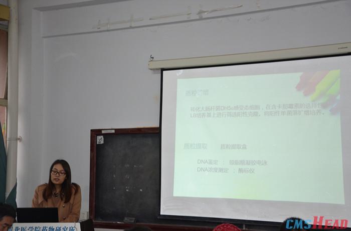 张丽娟同学分别从铜绿假单胞菌DNA疫苗的研究背景、重组质粒的制备、动物的分组以及免疫方法、免疫血清的制备、T淋巴细胞的分离以及最终各项免疫指标检测等方面给在座的老师和同学做了介绍。汇报后,在座的老师以及同学就课题中感兴趣的内容进行了热烈讨论。