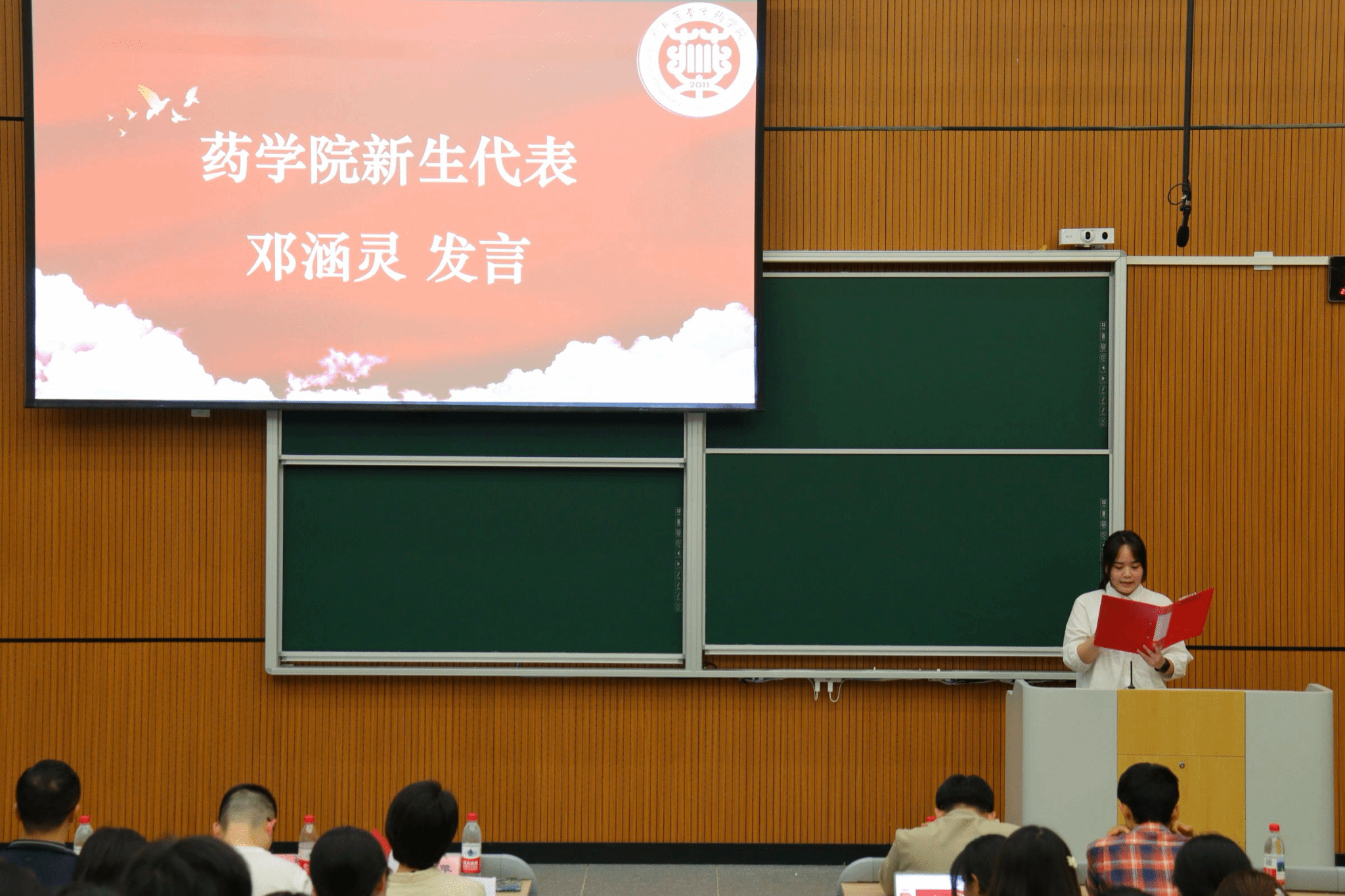 随后,刘军宣读《药学院2025级新生班主任聘任文件》,并为受聘班主任颁发聘书。教师代表张华以温暖话语欢迎新生,寄语学子珍惜时光、勇攀高峰。在校生代表严静玉从课程学习、实验技能提升及学生工作平衡三方面分享经验,为新生提供实用指导。新生代表邓涵灵表达了对大学生活的憧憬与期待。活动尾声,院系领导为新生代表佩戴院徽,象征着2025级新生正式成为“川北医药学人”。