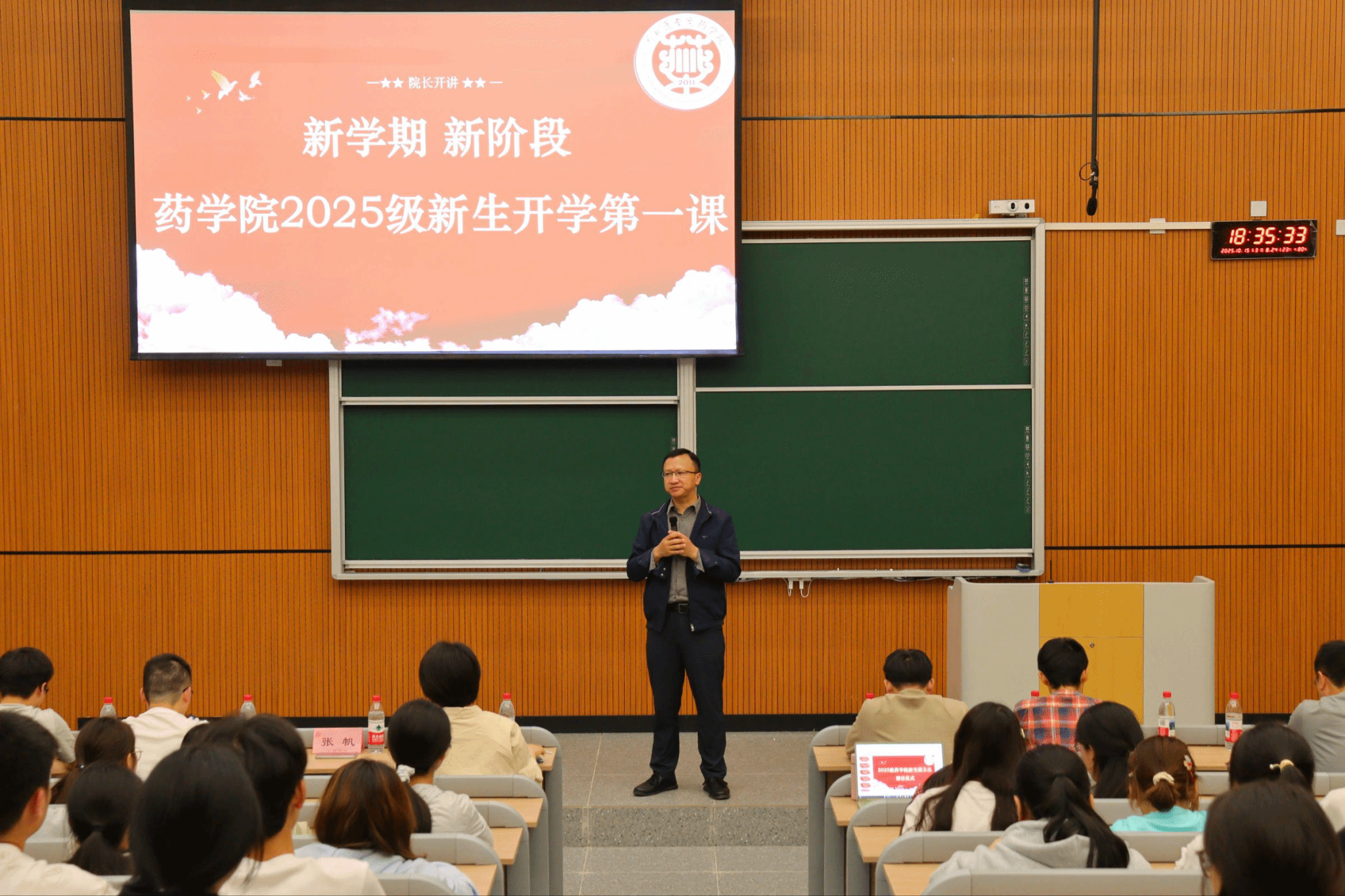 冯莉苹以“药”字为核心元素引入药学文化内涵。张帆为全体新生讲授“开学第一课”,介绍了药学与临床药学专业的学科特色与发展前景,并从学习方法、科研实践、社团参与及生活适应等方面为新生提供建议。他强调:“药学事业关乎人民健康,希望同学们以严谨态度夯实专业基础,在创新中践行责任担当。”
