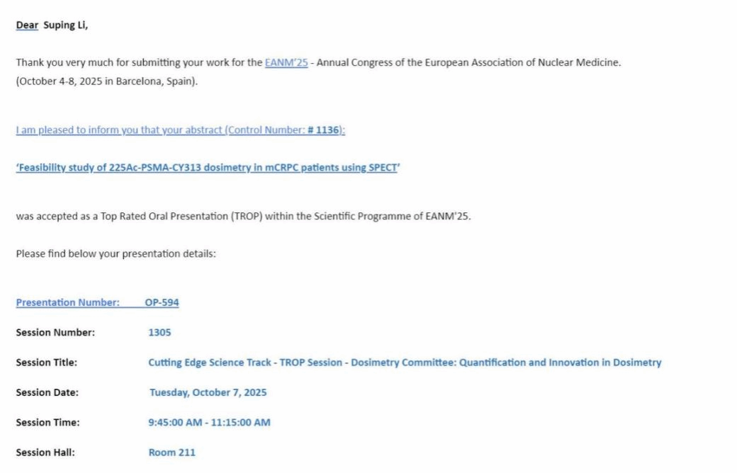 此次入选的两项研究具有显著的临床价值和科学意义, 新型靶向治疗探索:“225Ac-PSMA治疗mCRPC疗效及安全性研究”,系统评估了新型放射性核素药物225Ac-PSMA的临床治疗潜力,为攻克晚期前列腺癌提供创新解决方案;精准剂量学优化:“基于SPECT成像的mCRPC患者225Ac-PSMA剂量学研究” 创新性运用分子影像技术,精准解析药物剂量与疗效、安全性的内在关联,为实现个体化精准治疗奠定关键技术基础。