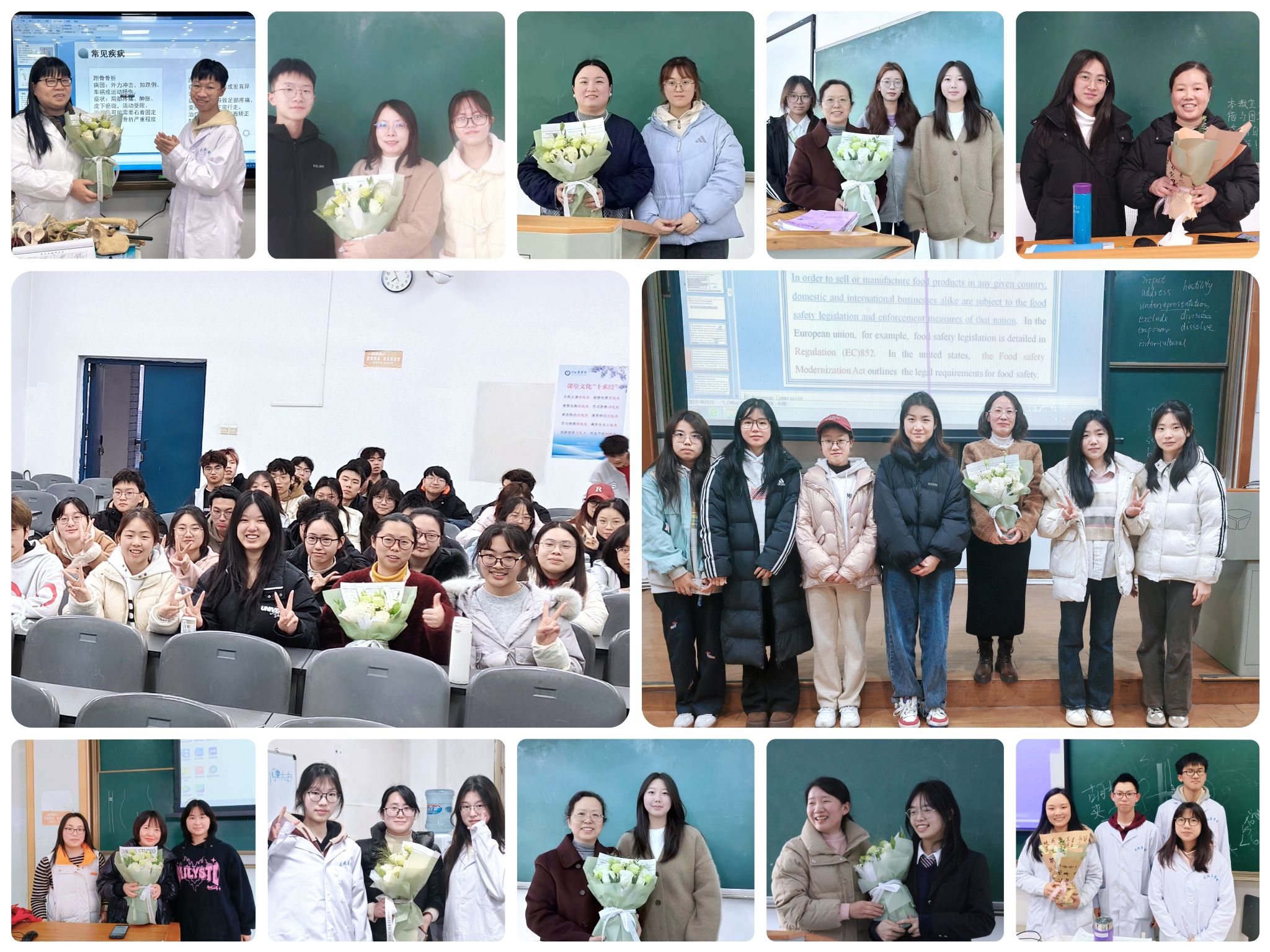 清晨,学生代表们满脸喜悦的手捧康乃馨和玫瑰花束为教室、实验室、办公室坚守岗位的女教师们送上节日祝福。每束鲜花都附有学生亲笔书写的祝福笺:“讲台育桃李,匠心映芳华”、“愿您生活如诗如画,岁月温柔以待”......祝福的话语传递着浓浓的学子深情,将教育者的坚守与学生的感恩化作春日里最温暖的对话。同学们上课前齐声祝福老师节日快乐,物理教研室李文雪老师接过学生递来的花束,连声道谢:“没想到孩子们这么细心!”办公室内,辅导员桌上绽放的鲜花与“您是我们的心灵灯塔”贺卡相映生辉。鲜花所至之处,快门声与欢笑声交织,师生并肩的画面定格成春日校园的温馨剪影,知识传递的温度与情感流淌的芬芳,编织成大学校园里最美的画卷。