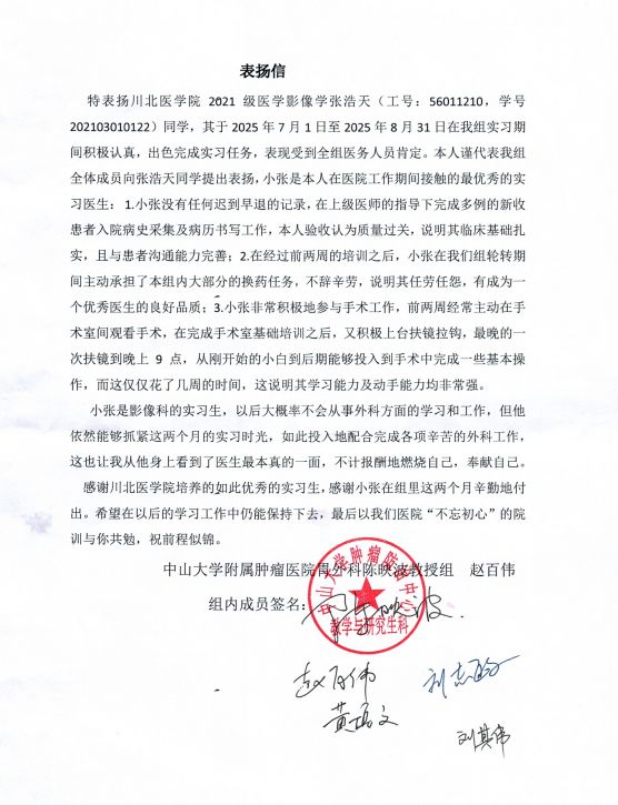 2025年7月至8月,张浩天同学于该单位完成为期两个月的外科实习。实习期间,他始终保持全勤,无迟到、早退现象,在带教医师的指导下,高效完成多例新入院患者的病史采集与病历书写工作,展现出扎实的专业基础与良好的医患沟通能力。经过系统培训,张浩天主动承担小组内大部分换药任务,踏实勤勉、尽职尽责。在手术实习中,他从初期观摩逐步成长为可独立完成扶镜、拉钩等基本操作的实习医生,其快速学习和积极动手的能力受到带教团队的一致好评。实习单位在表扬信中指出,张浩天同学职业态度端正、专业能力突出,并对川北医学院培养高素质医学人才的工作表示赞赏与感谢。