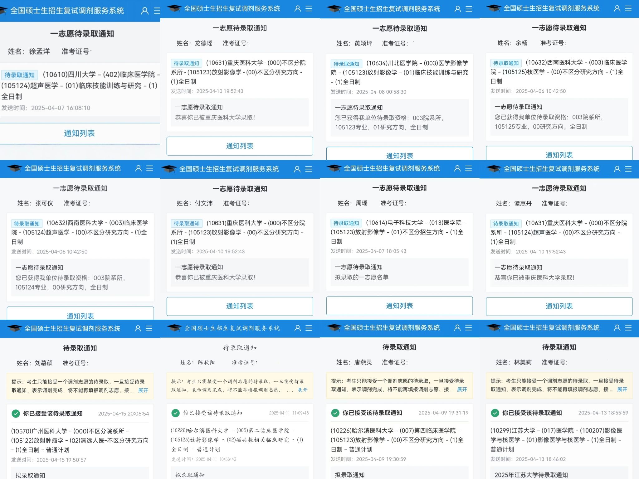 【全员告捷】学霸支部再创佳绩。在2025年全国硕士研究生招生考试中,医学影像学院医学影像学本科生党支部13名应届毕业生党员实现全员高分上线。截至发稿,12人已成功上岸,1人正在进行调剂,其中2名党员叩开“985”高校四川大学、电子科技大学的大门,另外10名党员上岸的具体情况为:广州医科大学1人、江苏大学1人、哈尔滨医科大学2人、重庆医科大学3人、西南医科大学2人、川北医学院1人,以硬核成绩彰显了新时代学生党员的先锋力量。