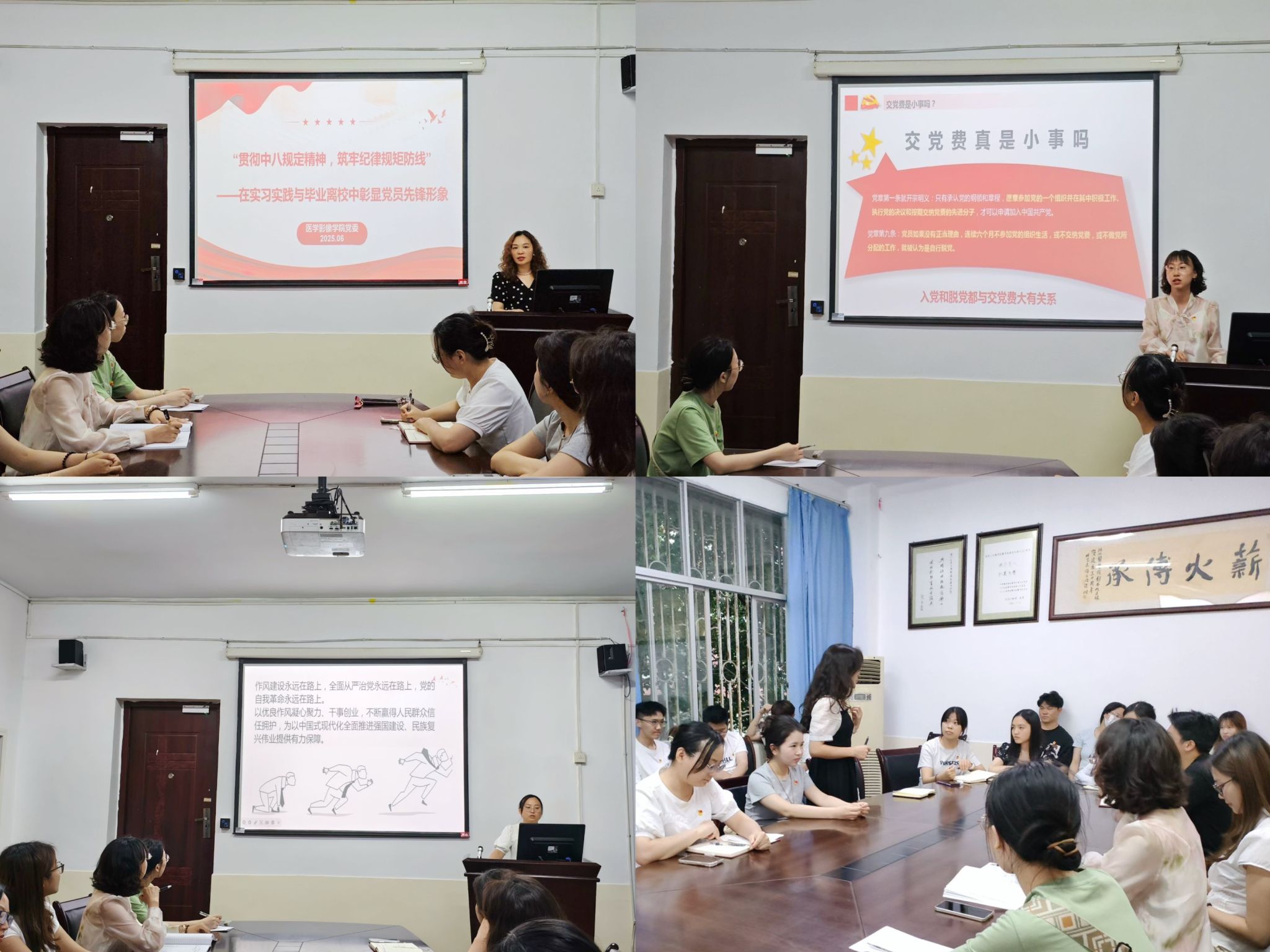 活动中,胡玲老师领学了党的十八大以来深入贯彻中央八项规定精神的显著成效和宝贵经验,引导党员深刻理解其在推进全面从严治党、巩固党群关系、凝聚中国式现代化建设力量中的重大意义。李紫薇老师带领大家学习了《关于中国共产党党费收缴、使用和管理的规定》,强调按时足额缴纳党费是党员履行义务、增强组织观念的重要体现。庞娟结合中央八项规定及其实施细则,详细解读了文件出台的时代背景、核心要义及具体要求,逐条阐释了改进调查研究、精简会议活动等规定内涵。针对高校易发的“四风”问题,她紧密结合学生党员实际,剖析了形式主义、官僚主义、享乐主义和校园奢靡浪费等方面的典型案例,警示大家时刻绷紧纪律之弦,筑牢思想防线。针对实习实践与毕业离校两个关键阶段,对与会学生党员提出具体要求:一要严守纪律规矩,树立良好形象;二要端正工作态度,养成优良作风;三要提升能力素养,做到知行合一。会议强调,实习与毕业是检验党员能力和党性的重要时期,全体学生党员务必严格遵守规章制度,以严明纪律和务实作风完成各项任务,展现新时代青年党员的先锋形象。