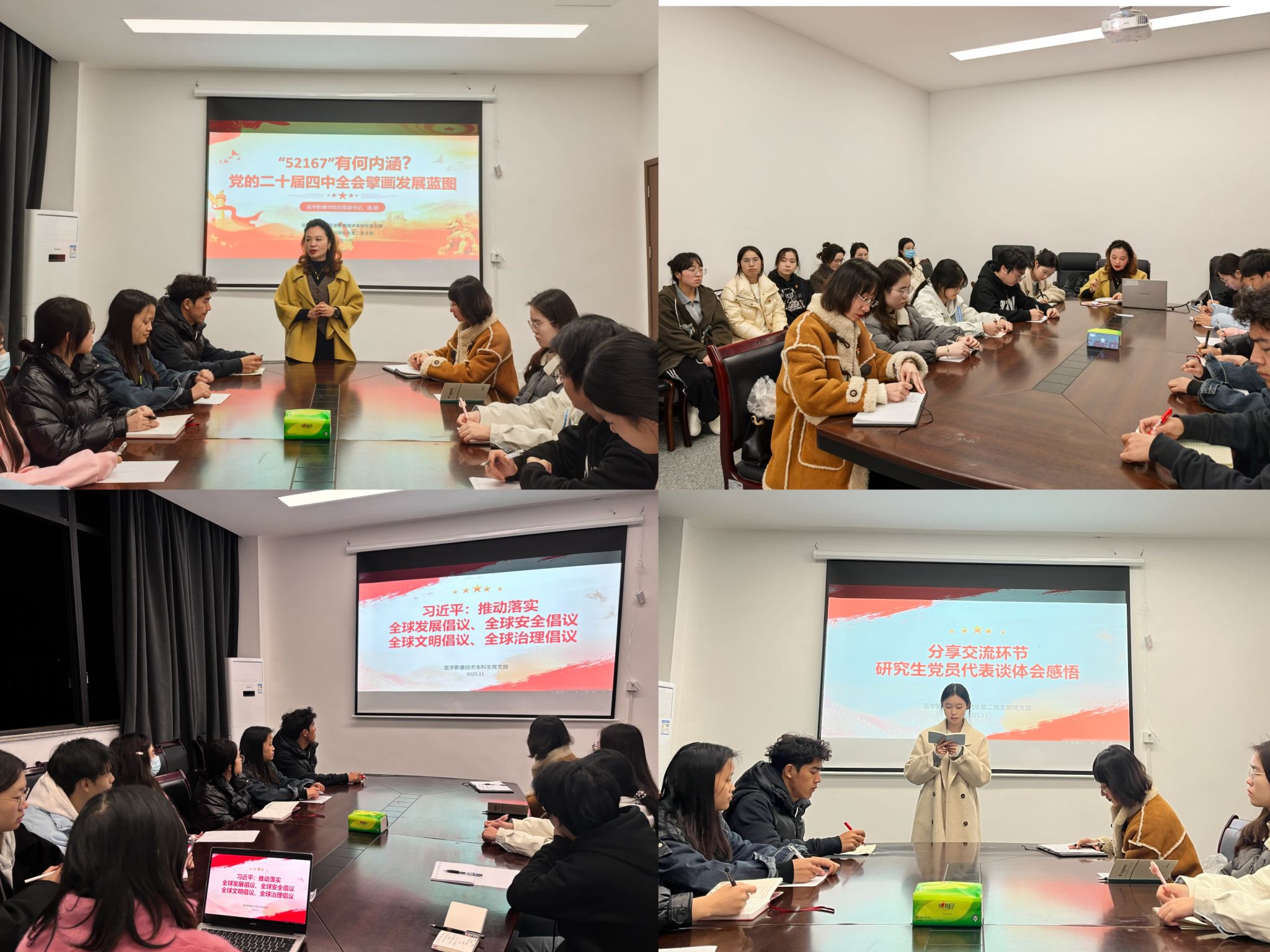 学院专职组织员胡玲首先带领大家学习了习近平总书记在全球妇女峰会上的重要讲话精神,以及《求是》杂志重要文章《推动落实全球发展倡议、全球安全倡议、全球文明倡议、全球治理倡议》,引导师生深刻领会其核心要义。随后,庞娟以“‘52167’有何内涵——党的二十届四中全会擘画发展蓝图”为题,系统梳理了党的十八大以来中央全会的战略部署脉络,并围绕“十五五”时期的发展目标、基本原则和重点任务,对“52167”数字化表达作了深入解读,阐释了规划建议的内在逻辑与发展愿景。她强调,“十五五”时期是基本实现社会主义现代化夯实基础、全面发力的关键时期,全体师生应进一步提高政治站位,坚持学深悟透、融会贯通、学以致用,切实把全会精神转化为推动学院发展和个人成长的实际行动。学生代表冷溢寒在发言中表示:“全会作出的部署既是时代赋予青年的考题,也是对我们的殷切期望。我将把学习成果转化为专业学习的动力,努力将个人理想融入健康中国建设,为医疗领域新质生产力发展贡献青春力量。”