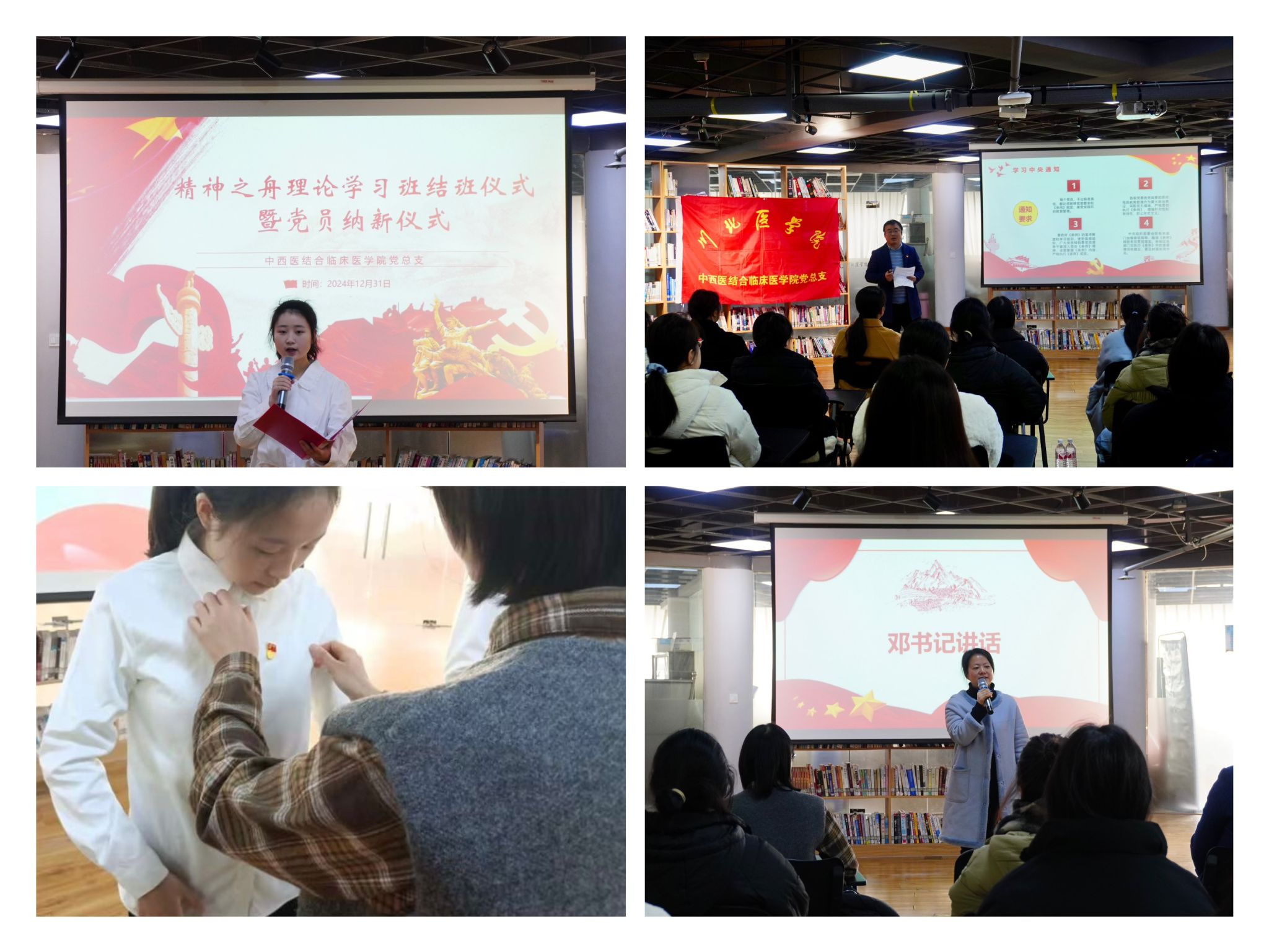 进一步加强党员的培养教育,中西医结合临床医学院党总支于12月31日上午在青年之家开展精神之舟理论学习班结班仪式暨党员纳新仪式,该院党总支副书记邓海英、全体在校师生党员、新发展党员、入党积极分子参加。
