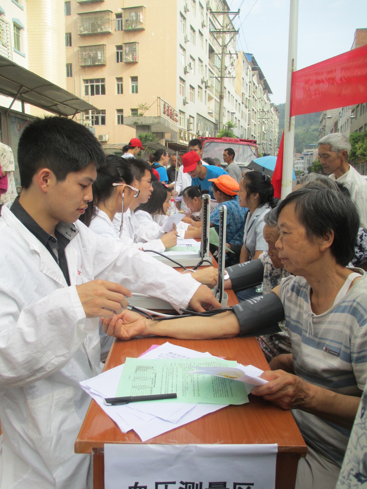 活动开始后,川北医学院社会服务队分组给马鞍人民做了测量血压、听诊心肺等多项常规检查。随后由川北医学院邓老师和仪陇县第二人民医院龙荣华主任出席会诊。对此,当地百姓大加赞赏,其中有一大爷感激道:“谢谢国家,谢谢你们啊!”