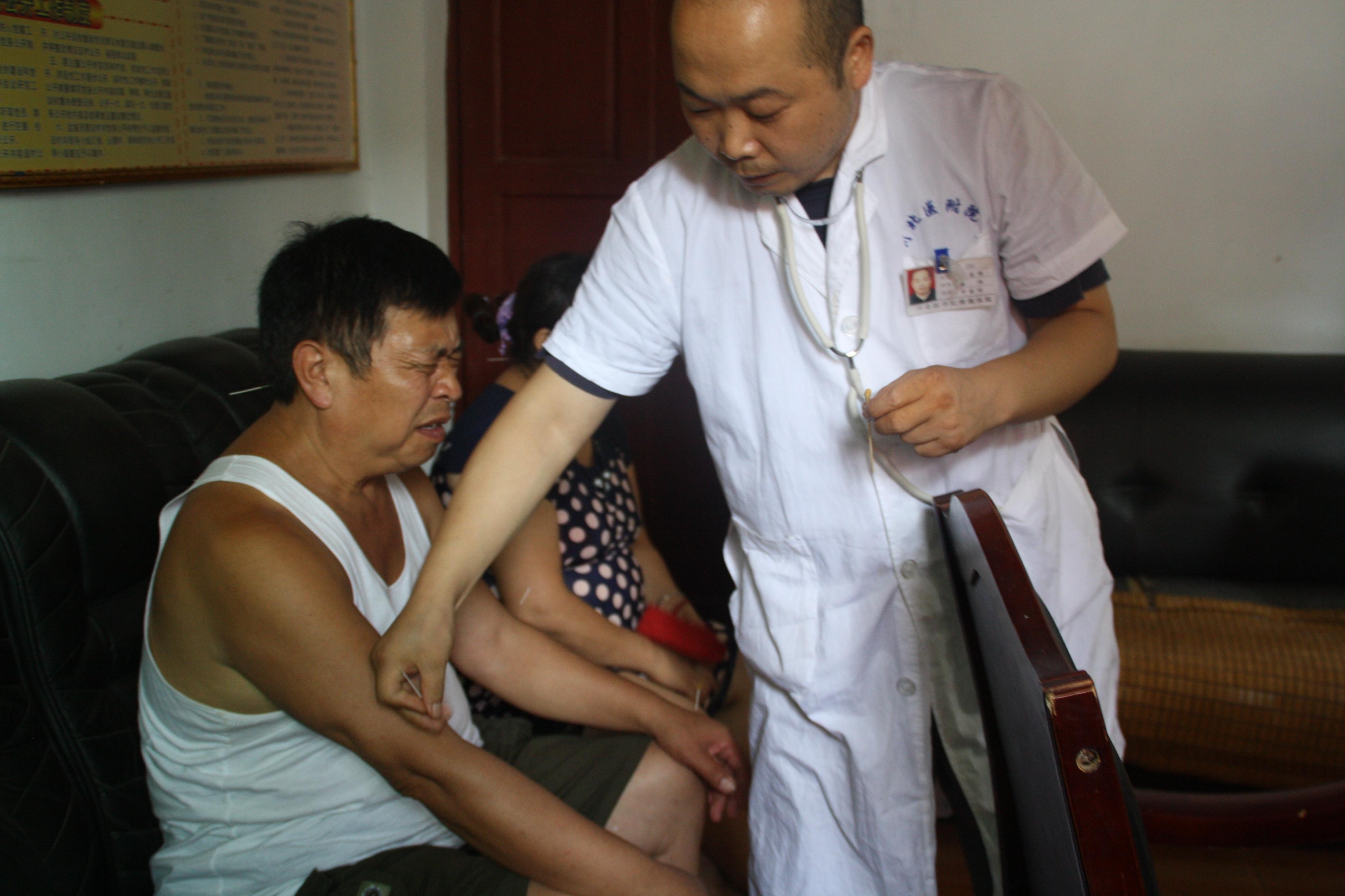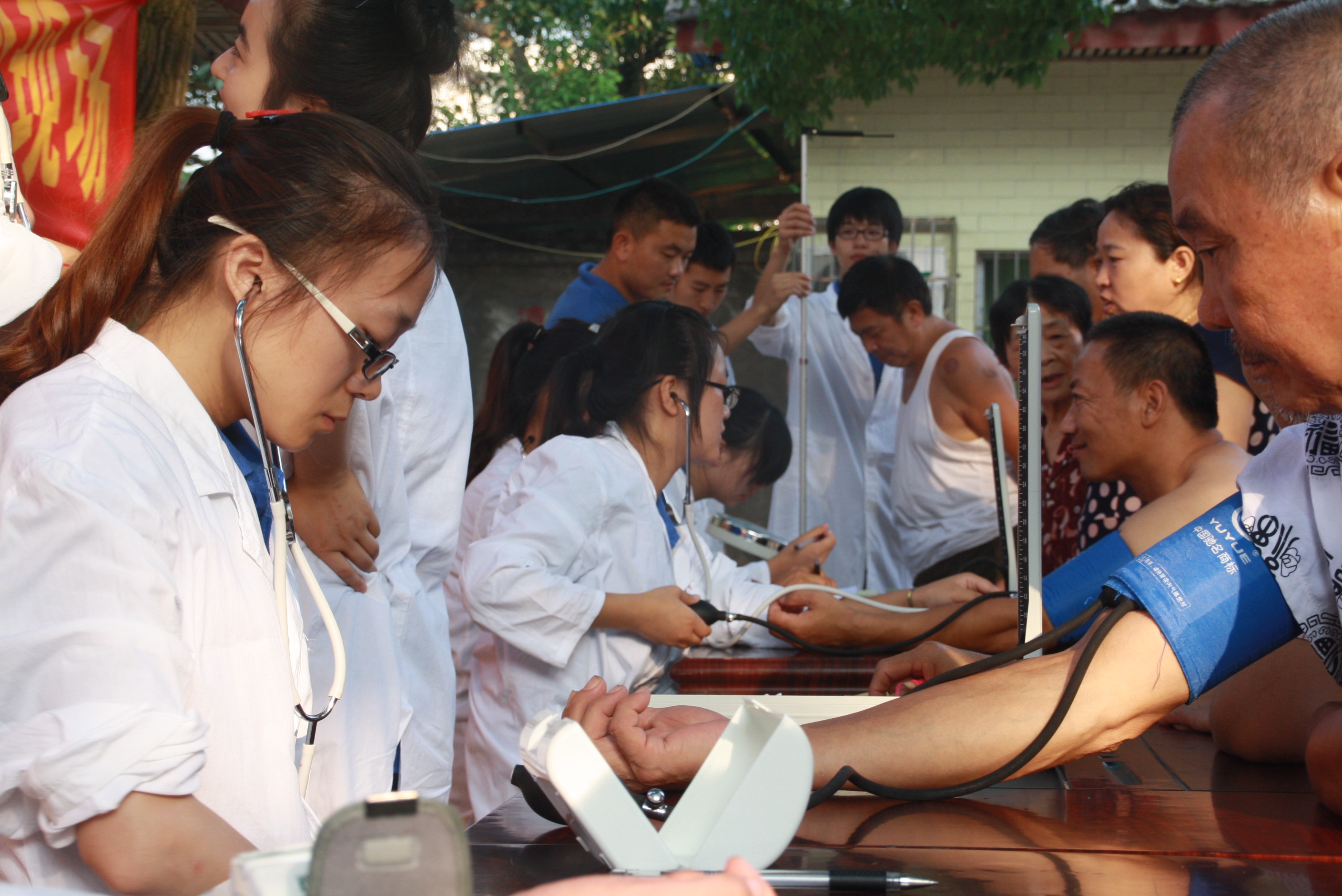 活动过程中,队员们秉承着科学安排、规范操作的原则,为就诊的村民仔细地进行检查,对他们的疑问耐心的解答,有的队员更是与一些孤寡老人交谈,而更多的是倾听。虽然烈日当空,但义诊仍如火如荼的有序进行。一部分村民陆陆续续向雍医生进行身体健康各方面的咨询,而雍医生则向中老年人做了心血管方面相关知识的普及并对心血管疾病的预防做了简单的概述。通过对疾病防治手册的阅读和雍医生专业的讲解,村民们对高血压、冠心病、动脉粥样硬化等慢性心血管疾病的危害及预防有了更为深入全面的认识。此外,受病情困扰较为严重的村民则一个接一个地进入临时诊室让温医生进行诊断并采用针灸,推拿、中药调理等方式进行了治疗。