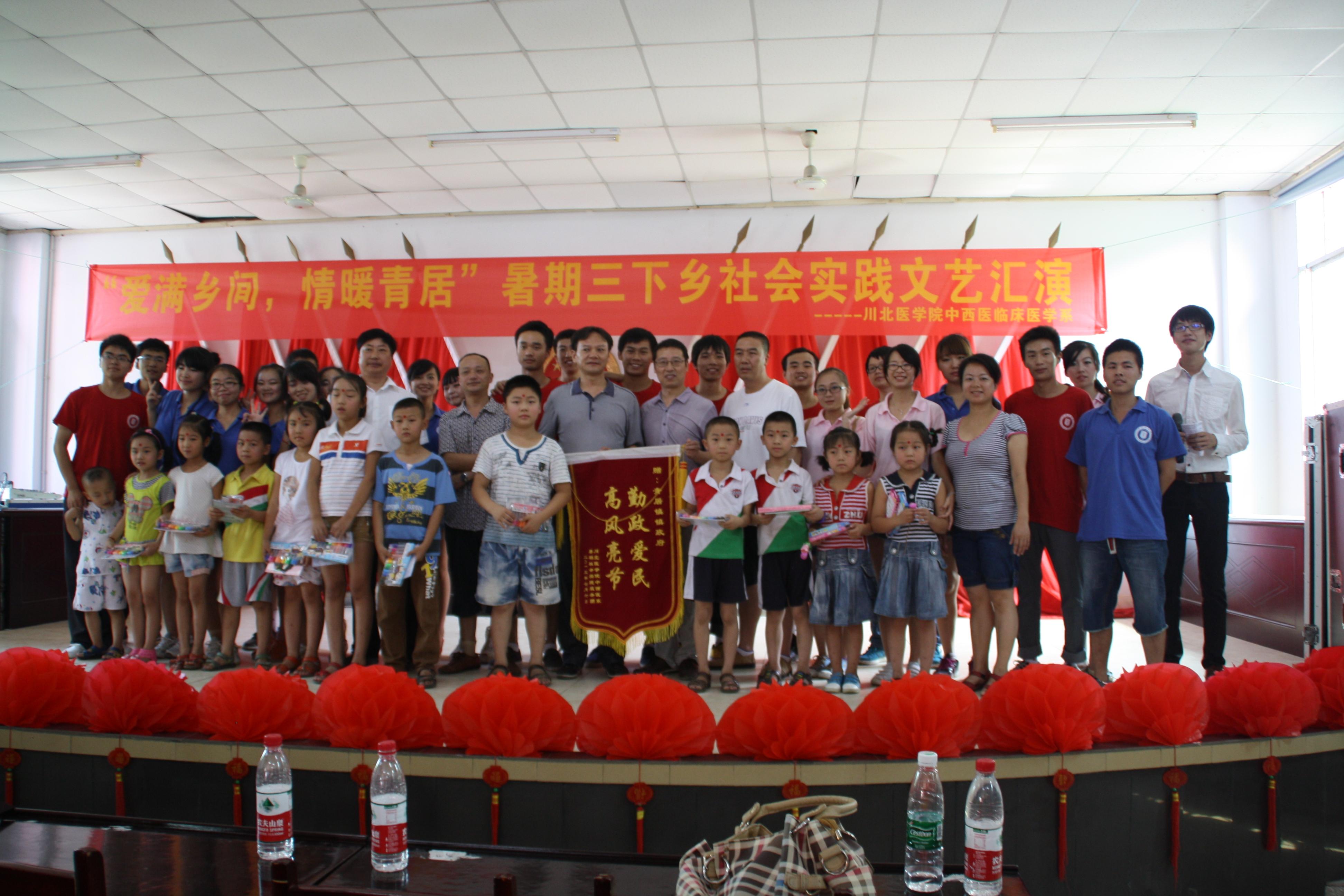 为了响应文化下乡的号召,丰富村镇居民的日常生活,7月15日,上午9时,川北医学院中西医临床医学系社会实践服务队在青居镇政府礼堂举行了“三下乡”文艺汇演。青居镇党委暨人大主席杨方平、川北医学院五系联合党总支部书记兰海涛、青居一小副校长韩勇等出席本次汇演。