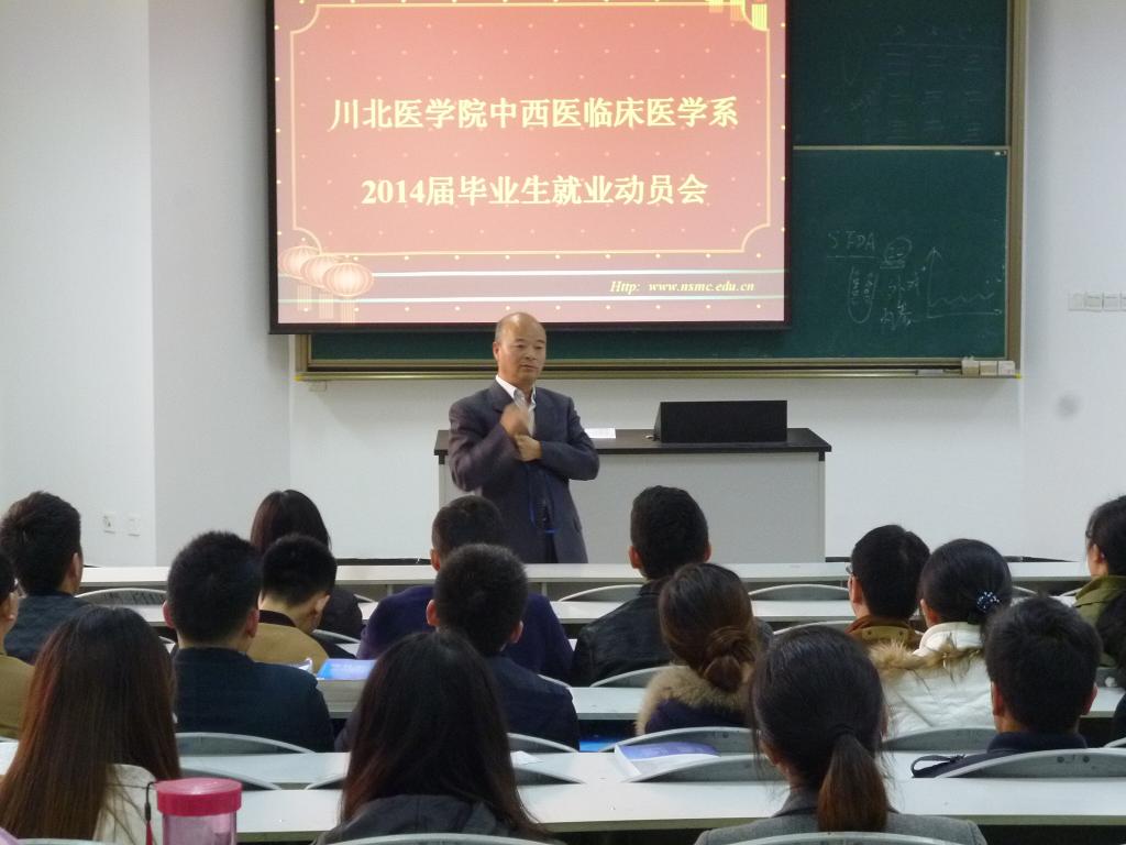 11月20日下午5:00,中西医临床医学系系在西区一教楼402 教室召开“中西医临床医学系2014届毕业生双选会动员会”。中西医临床医学系副主任黄九龄教授和中西医临床医学系学生科老师以及中西医系2009级学生参加了本次大会。
