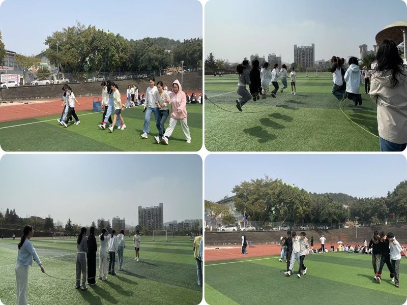 同心协力,共展风采,本次活动设置了多个极具体验感和挑战性的项目。集体跳绳环节中,同学们分组协作,长绳在大家的手中有节奏地挥舞,队员们默契配合,一同起跳、落地,展现出协作精神。两人三足项目同样精彩,同学们将相邻的腿绑在一起,共同前进,为了保持平衡和速度,同学们赛前反复沟通、练习,比赛时喊着整齐的口号,步伐一致,在彼此的配合与信任下,向着终点稳步迈进。此外,拔河项目等趣味项目,也让现场充满了欢声笑语。