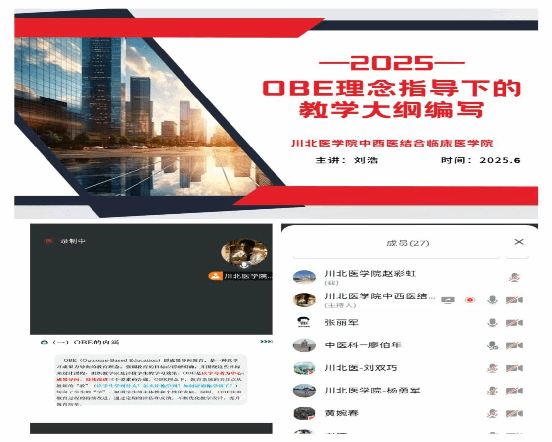 2025年6月24日,中西医结合临床医学院在线上召开“OBE(Outcome-Based Education,成果导向教育)理念指导下教学大纲撰写培训会”,学院校本部教师及遂宁市中医院全程教学点教师参加学习。学院副院长刘浩主持会议,并开展专题讲座。