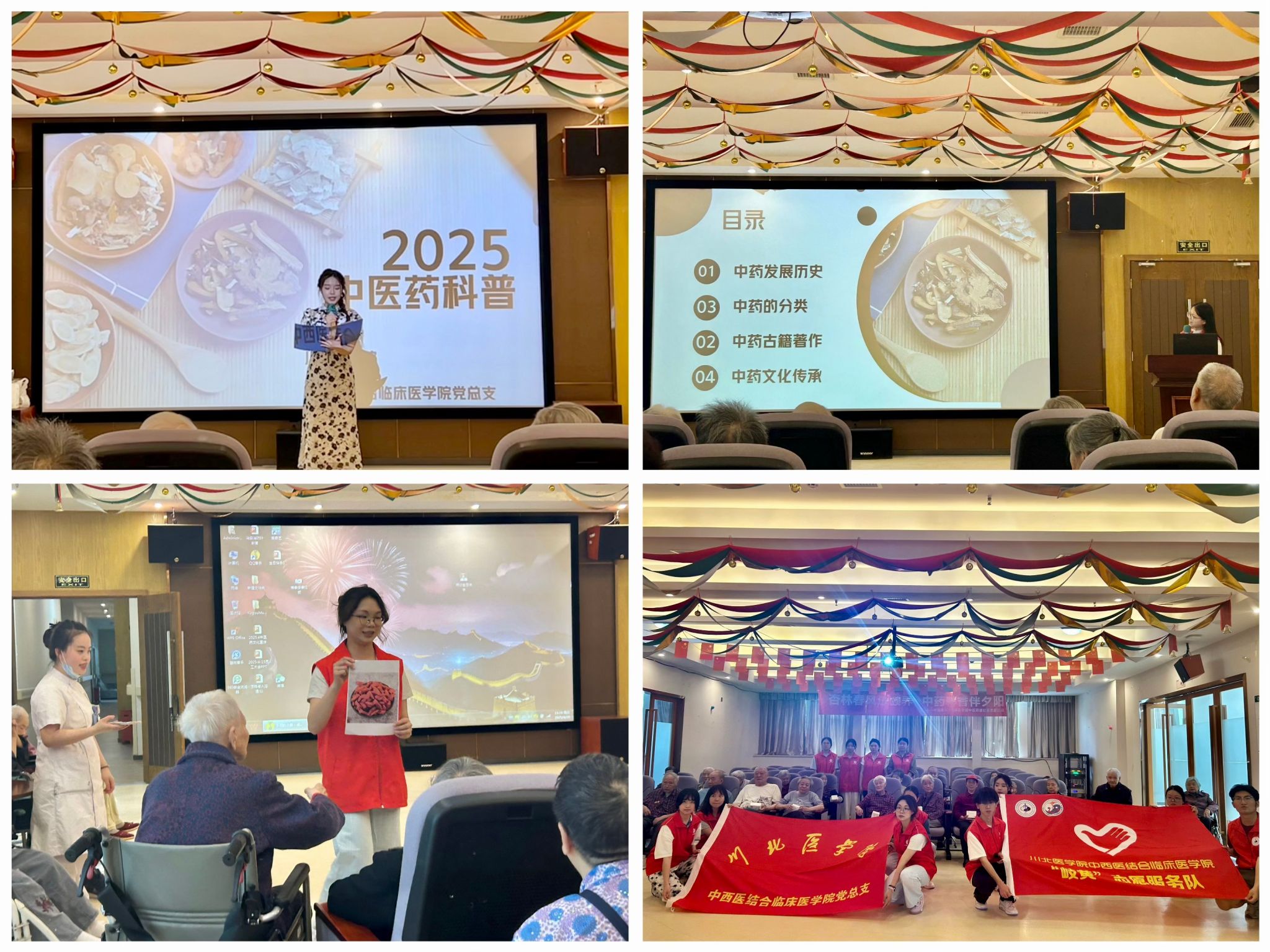 实践环节中,志愿者运用揉法、滚法、点按法等中医推拿手法,为老人们进行肩颈、腰背、四肢的按摩,帮助缓解肌肉紧张与关节不适。志愿者还准备了菊花枸杞茶、陈皮山楂饮等养生茶饮,结合老年人的体质特点,细致讲解每款茶饮的方剂配伍、保健功效与饮用禁忌。 此外,志愿者还针对老年人常见的用药误区,如随意增减药量、盲目相信偏方等,结合典型案例进行了深入浅出的科普。在中草药知识问答环节,经过志愿者的科普,老人们纷纷抢答关于药材辨识、养生常识等问题,现场气氛热烈。活动结束后,志愿者为老人们赠送准备好的实用小礼品。志愿者罗沁钰有感而发:“看到老人们激烈地回答中医问题,我深感付出的价值。未来,我将继续秉承服务精神,积极参与志愿活动,为更多需要帮助的人带去温暖与希望。”